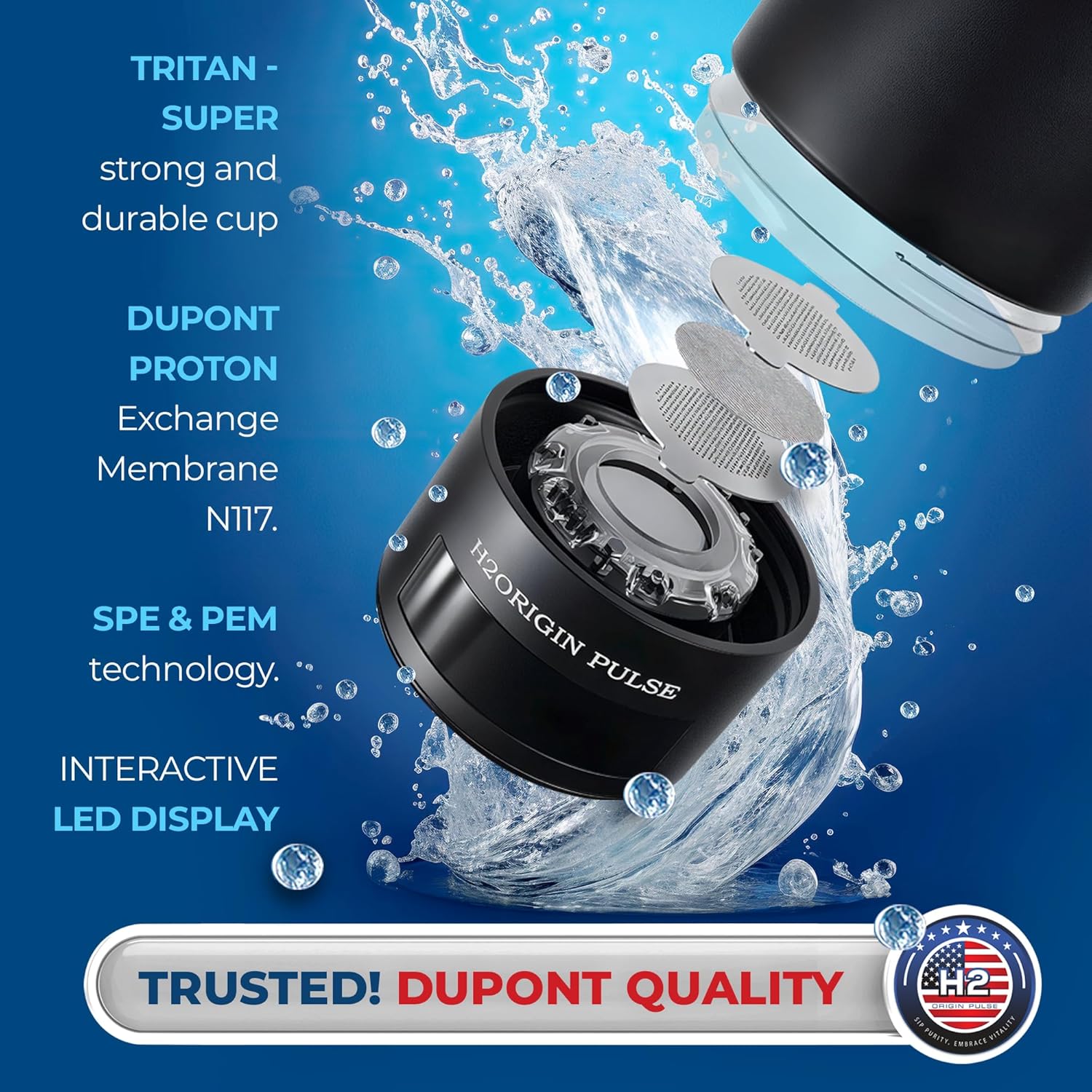 The H2Origin Pulse features state-of-the-art SPE and PEM technology for efficient hydrogen infusion. Choose between a quick 3-minute saturation for 2000 ppb or an extended 18-minute mode for up to 9000 ppb, tailored to meet your hydration needs efficiently