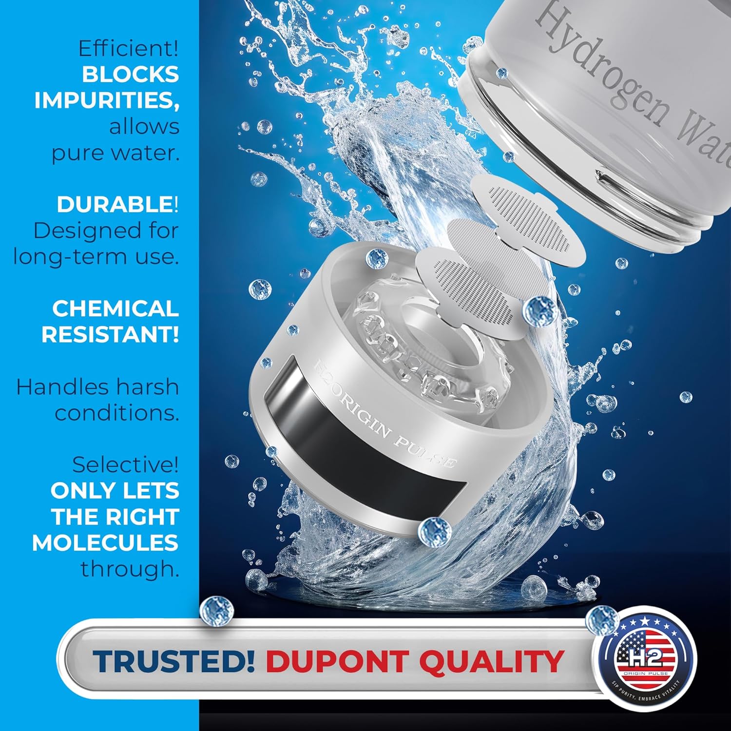 The H2Origin Pulse features state-of-the-art SPE and PEM technology for efficient hydrogen infusion. Choose between a quick 3-minute saturation for 2000 ppb or an extended 18-minute mode for up to 9000 ppb, tailored to meet your hydration needs efficiently